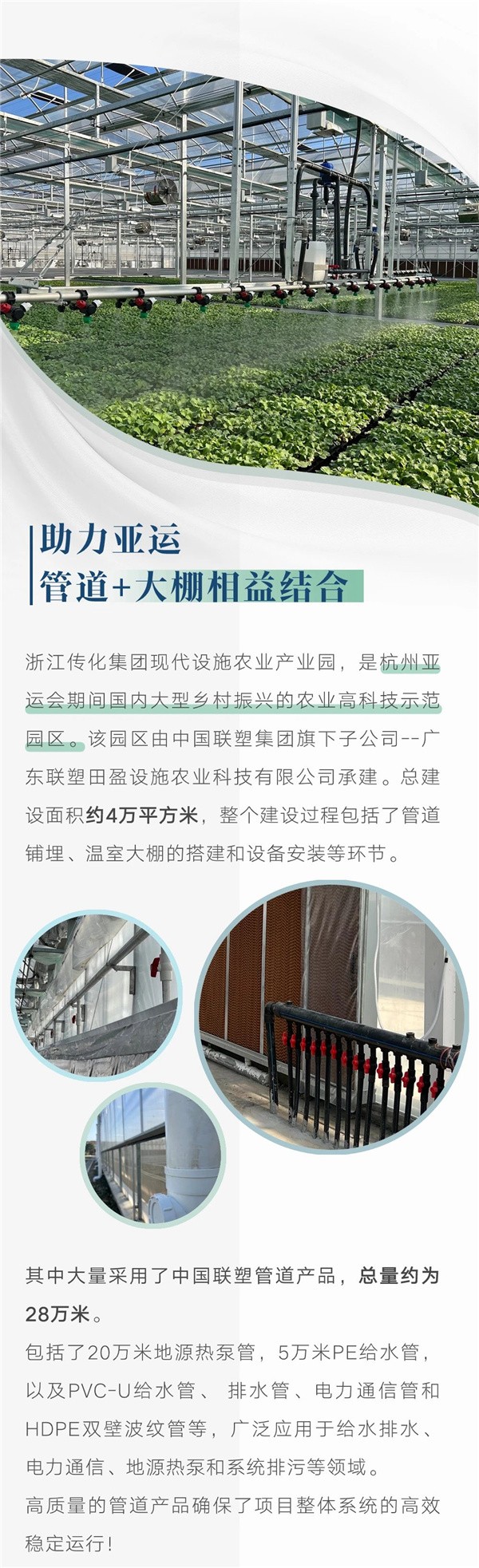 浙江传化集团现代设施农业产业园,是杭州亚运会期间国内大型乡村振兴的农业高科技示范园区。该园区由中国联塑集团旗下子公司——广东联塑田盈设施农业科技有限公司承建。总建设面积约4万平方米,整个建设过程包括了管道铺埋、温室大棚的搭建和设备安装等环节。