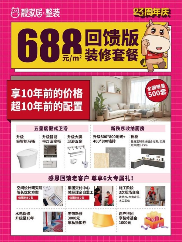 今年6月喜迎端午大促×23周年庆,靓家居装修套餐配置全面升级,推出“回馈版”688元/㎡装修套餐,全国限量500套,享10年前的价格,超10年前的配置!以超高质价比带您体验五星级度假式卫浴、新秩序收纳厨房......感恩回馈所有选择靓家居的家庭业主,还有周年庆专属礼相送,享受VIP特权!