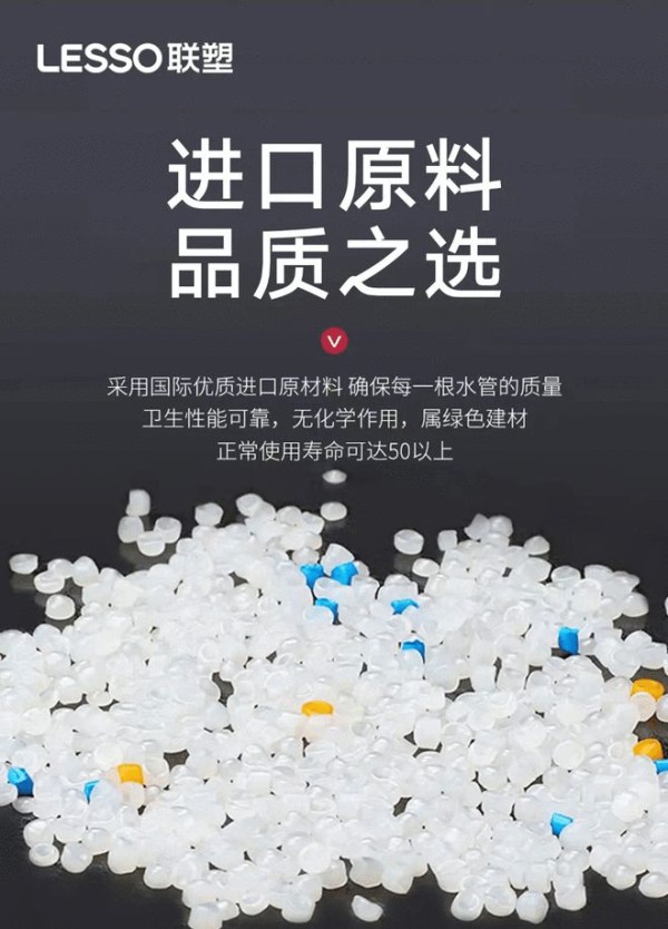 例如联塑家装蓝净瓷芯系列双色PP-R给水管:双层共挤结构,阻光性更强,陶瓷质感光洁内壁,洁净无瑕不易结垢,有效防止管内细菌和青苔滋生,让家居用水更洁净;升级产品配方,分子结构更均匀,耐温耐压性能优越,减少日后维护的成本,延长使用寿命;大弧度流线型管件配套,减少水流阻力50%以上,降低水锤冲击,供水更顺畅。