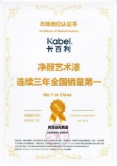 尚普咨询集团通过对净醛艺术漆市场深度调研后,确认了2021-2023年卡百利在净醛艺术漆全渠道市场中销量第一的地位,并为卡百利颁布 “卡百利 净醛艺术漆连续三年全国销量第一”市场地位认证证书。