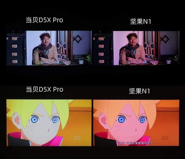 通过实拍效果我们可以看出来,得益于更高的亮度,以及解码技术,当贝D5X Pro无论是播放电视剧还是动漫,亮度、色彩、清晰度等方面都要明显优于坚果N1,且画面看着更加自然舒适,没有三色激光的散斑和色边问题。这也是能和两款产品的显示参数对得上的。