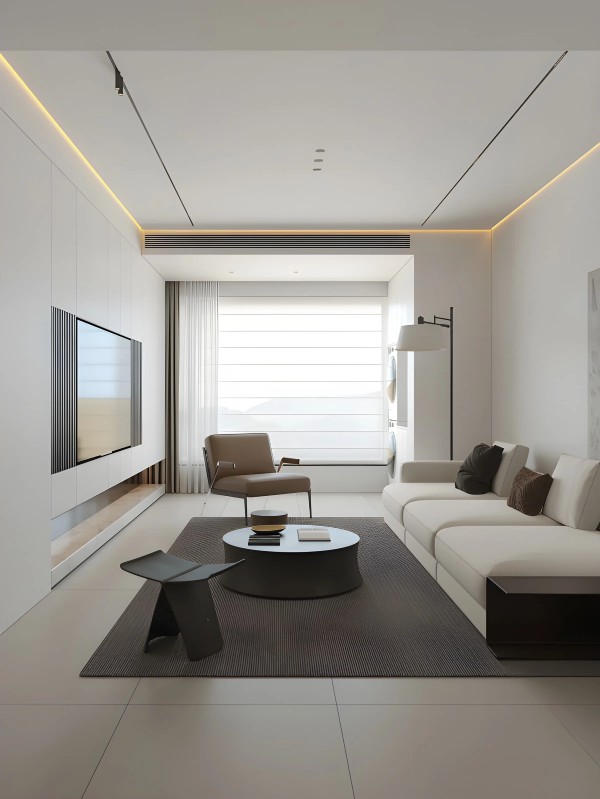 这套设计主打现代简约风。以纯净的白色作为空间主色调,营造出简洁大气的氛围。悬浮式的电视背景墙,搭配线性灯光,不仅拉伸了空间层次感,还增添了几分科技感。