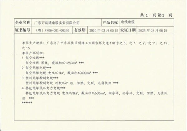 历经大半年技术攻关与严谨测试,万瑞通宣布:1.8/3kV电力电缆成功拓项,通过国家特殊电线电缆产品质量检验检测中心型式试验,荣获广东省市场监督管理局颁发的生产许可证。