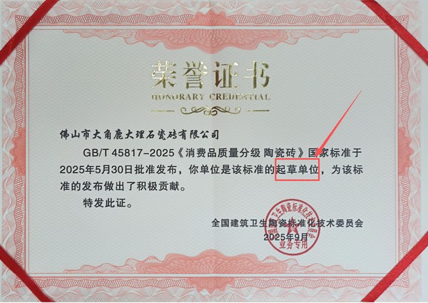 新浪家居简报:近日,陶瓷行业迎来高光时刻。大角鹿品牌凭借其卓越的产品品质,荣获中国建筑卫生陶瓷协会公布的首批“5A级产品”认证。与此同时,大角鹿还作为起草单位参与了《消费品质量分级 陶瓷砖》国家标准的制定。双重权威认可,充分彰显了大角鹿在行业内的技术引领地位与硬核产品力,为消费者选购提供了权威指南。