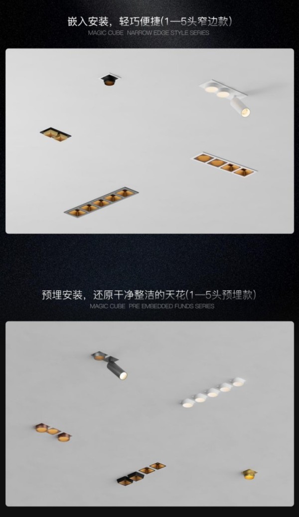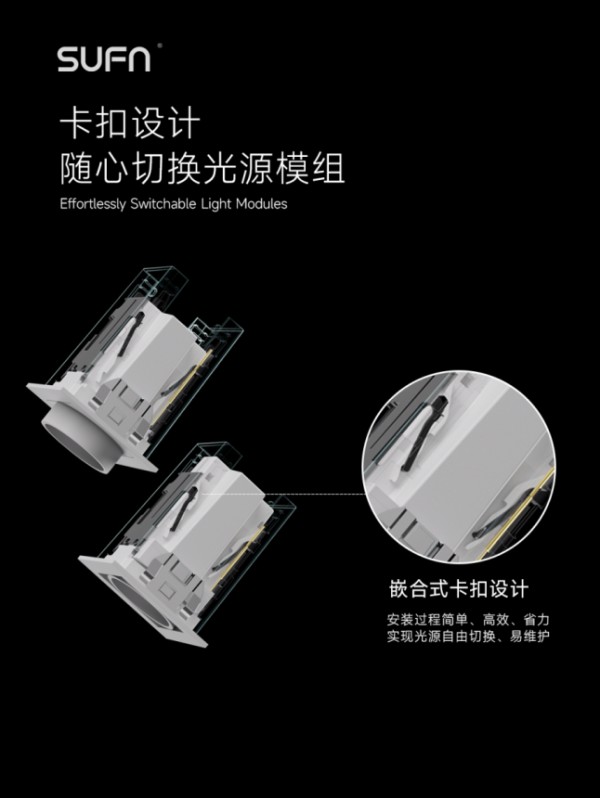 特别值得关注的是,MINI魔方系列创新性地采用了卡扣式卡扣结构与精密电子弹簧针的组合设计。这一设计让灯具安装过程变得简单顺滑、高效省力,更实现了光源切换的自由随心,为后期光源模组的更换与灯具维护提供了极大便利。同时,该设计还赋予了设计师卓越的自由度与空间创造力,真正做到了实用与便捷兼具。