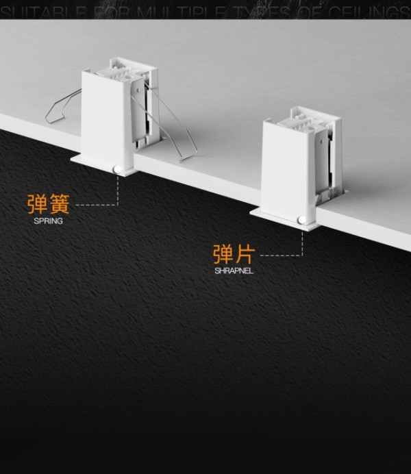 此外,产品还提供弹簧和弹片两种卡扣可选方案,适配多种天花类型,这种贴心的设计不仅可以轻松实现安装、拆卸面环的操作,更能达到易拆、不伤手、不破坏天花板的效果,极大降低了灯具在维护时给天花板带来的破损风险。