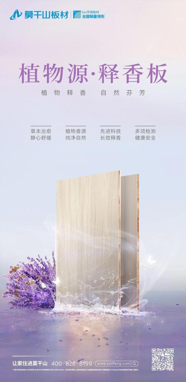 作为新一代释香功能型产品,植物源·释香板满足消费者对于绿色、健康、治愈性的情绪价值需求。莫干山植物源·释香板将草本植物薰衣草的治愈之力用于日常生活中,为生活居所提供舒适自然的植物清香,构筑独一无二的家装底色,舒缓身心又治愈情绪。