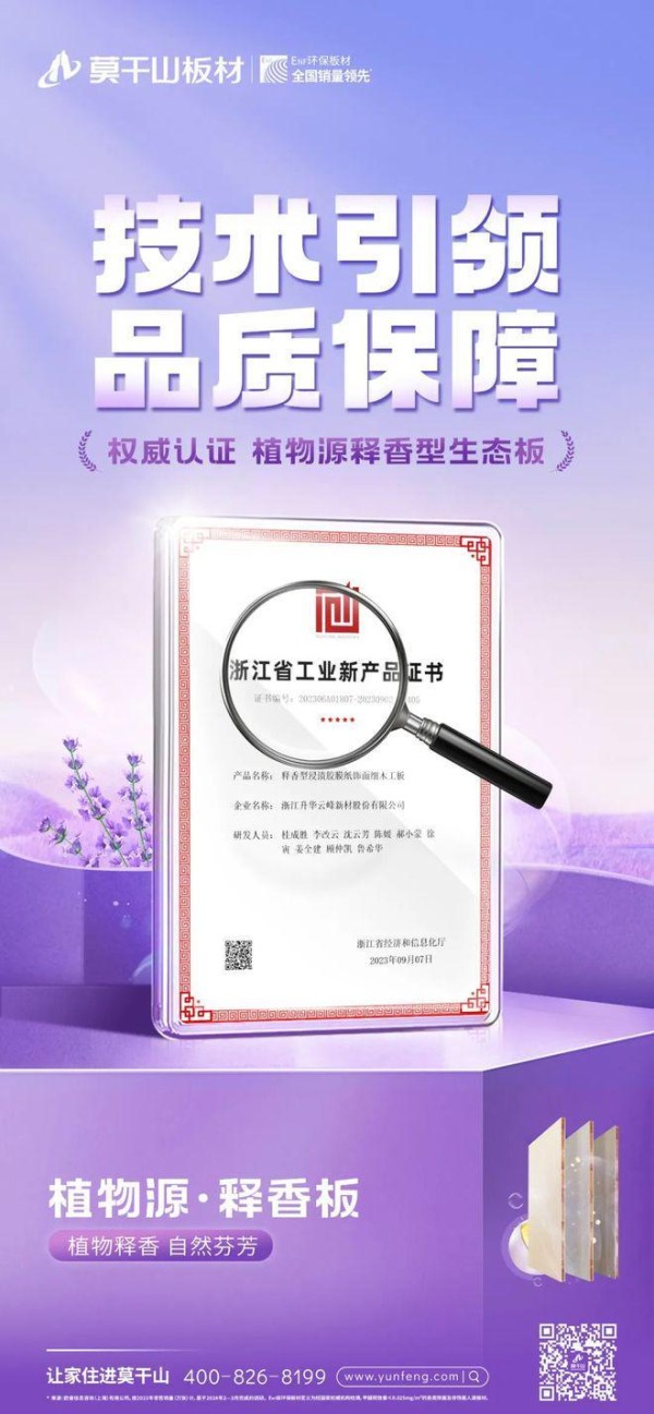 创新技术,是莫干山板材不断前行的驱动力,其自主研发的双壳互穿网络结构微胶囊技术,不仅赋予了释香板抗压耐热、香气释放持久稳定的性能,更在业界树立了新的标杆,并经省级工业新产品技术鉴定,认为该产品属于国际先进,首家研制!