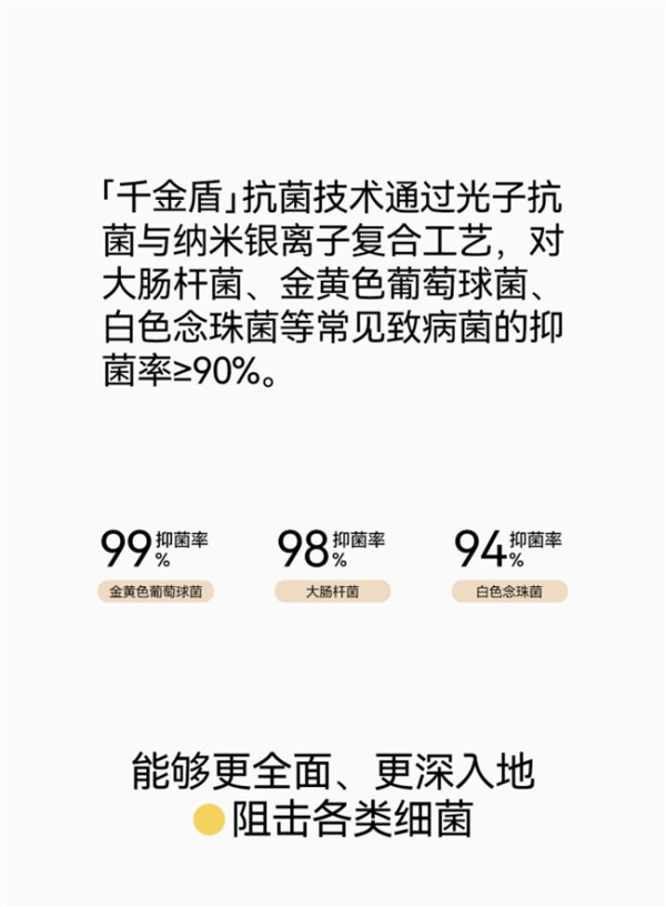 要特别注意的是,抗菌效果升级,绝对不能牺牲基础的安全性。三千金在升级【千金盾】10A 技术时,核心面料依然严格通过了“老爸抽检”的 138 项严格测试,确保没有甲醛、没有致癌染料。里面的抗菌成分也经过了严格挑选,安全又环保,不会给家里带来新的健康问题。