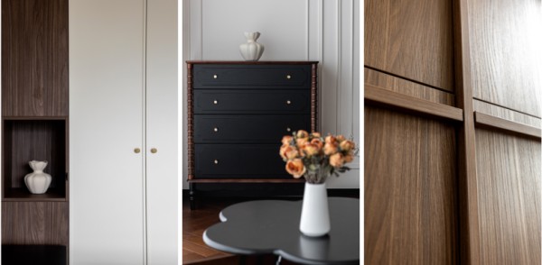 本案全屋定制主要选用柏厨家居木兰、木韵系列产品。木兰系列的门板采用拼框结构,以细腻肤感工艺与出众质感贯彻空间的优雅,奶油色和木纹搭配尽显温柔高级。木韵系列则以其现代中古风格、实木质感与骨骼线门型工艺,还原木皮真实的导管效果和细腻的纹路,赋予空间秩序感与节奏感。两者结合,完美契合法式复古风格,既保证了产品的耐用性,又通过一体化设计实现空间美学。