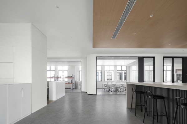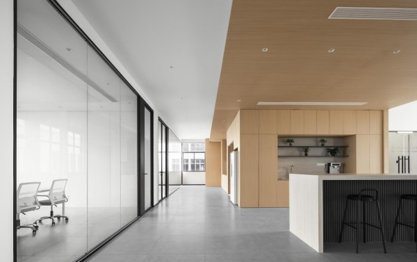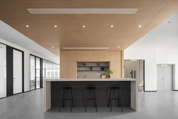 独立的抛中吧台,沿用了茶水柜灰色层板的材质和仿石纹岩板的大包围台面,既满足员工茶水补给需求,又提供了轻松的交流场景,缓解工作压力。整体设计通过色彩与材质的平衡,实现了功能性与美学性的统一。白色的通透、灰色的稳重与原木的温润相互融合,既符合现代办公对高效简洁的需求,又通过自然元素的植入,让空间更具亲和力,为员工打造出一个兼具专业感与归属感的办公场所。