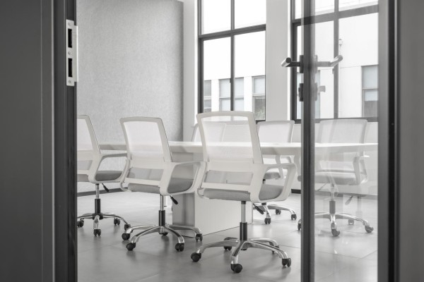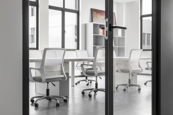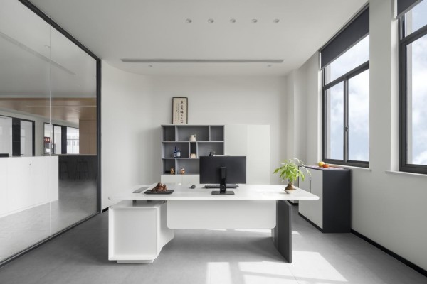 核心功能区中,开放式办公区采用原白色定制工位桌,桌面边缘圆润处理,搭配灰色人体工学椅,在硬朗的办公氛围中注入自然温度。
