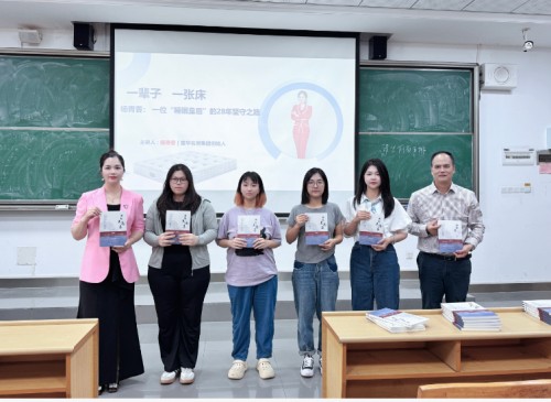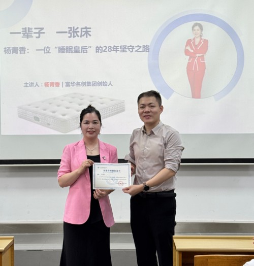 接着,她放慢语速:如今,富华名创公司已拥有“亿吻”“汤部尚书”“席梦思黑金”“青竺心舍”等板块,远红外、负氧离子、光波能量保健等 52 项专利被缝进同一款产品。她告诉同学们,企业做大后仍要“把社会责任缝进面料”——给山区小学捐床垫、为养老院换床品、用环保胶水减少 VOC 排放,“当世界因你而多一夜好眠,品牌自然就醒了。”