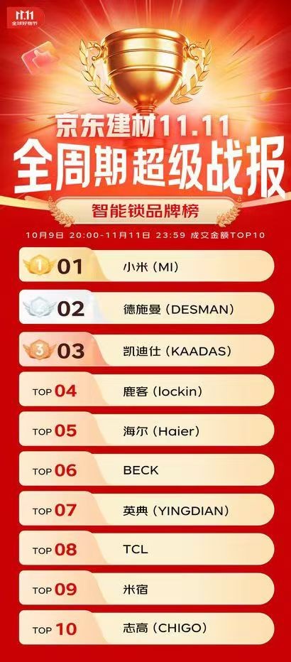 智能锁领军品牌德施曼在此次官榜中表现亮眼,在双11全周期,一举拿下抖音基础建材品牌榜TOP1、天猫智能门锁品牌榜TOP1、京东智能锁品牌榜TOP2,官榜成绩延续其品牌官方战报“十连冠”的领先之势,拿下智能锁全平台销额&销量第一;此外,德施曼在今年跑出多款国民爆款,大圣Q5FPro及麒麟R9系列横扫多个电商官方单品榜,以断层式领先优势夯实行业领导地位。