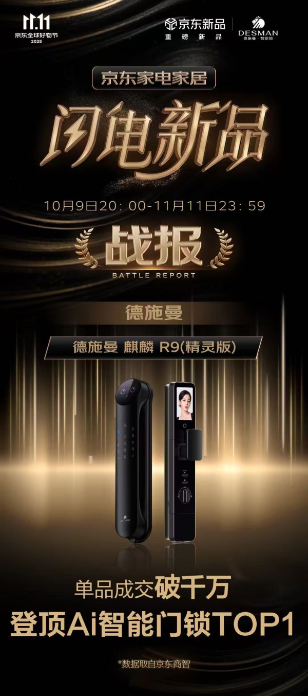 德施曼在三大平台官方榜单中均实现“霸屏式”领先。在抖音最新公布的官方战报中,2025年10月9日至2025年11月11日,德施曼勇夺基础建材品牌榜TOP1;而在天猫最新公布的官方战报中,德施曼同样拿下2025年双11全周期天猫智能门锁品牌榜TOP1;此外,德施曼还拿下京东双11全周期智能锁品牌榜总榜第二;其中德施曼大圣Q5FPro登顶京东双11全周期智能锁单品榜榜首,以领先同功能产品3.5倍的优势拿下断层第一!值得一提的是,作为行业首款AI智能锁,德施曼麒麟R9(精灵版)在京东平台单品成交破千万,登顶AI智能锁门锁TOP1。