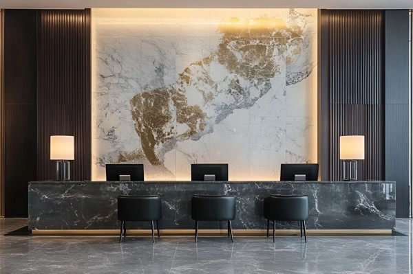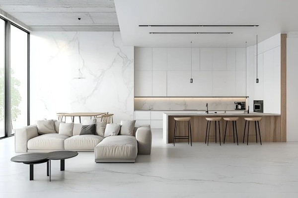 在不少高端场所里,随处可见 1200×2400mm岩板通铺,这么做可以大幅减少砖缝数量,营造出空间恢弘感,这也是小规格瓷砖拼接难以达到的效果。
