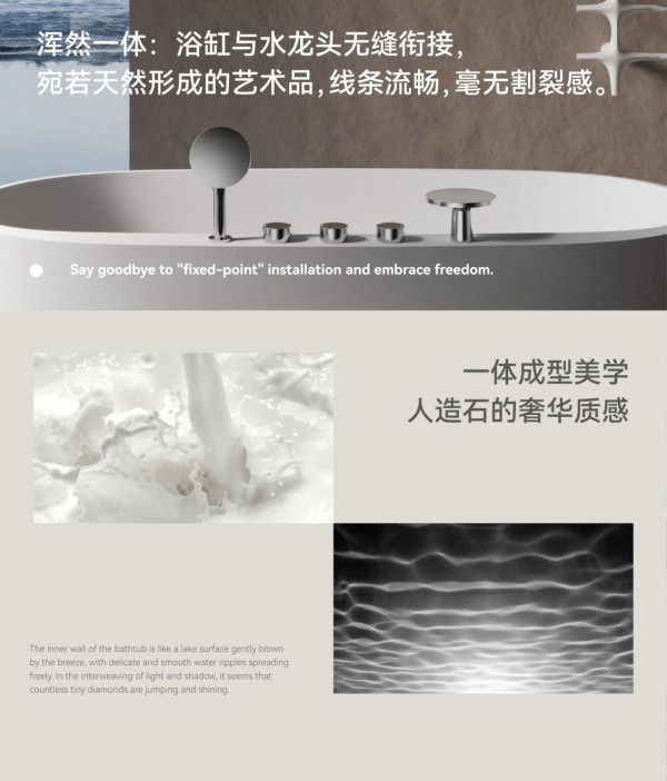 首款可直接安装于浴缸边上的一体式人造石浴缸,正式登场。它不仅仅是一个产品,更是一场关于浴室技术的革命。