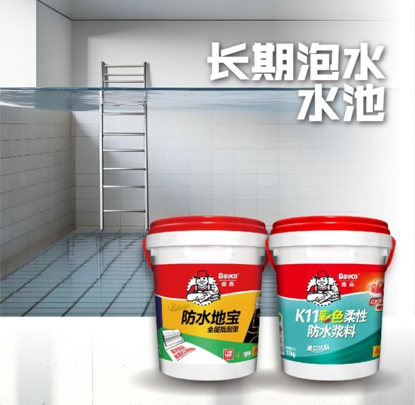 长期泡水的水池对防水材料的抗渗性能、浸水后的性能均提出了更高要求。这种场景的防水材料,我们推荐使用“防水地宝+柔K”组合。