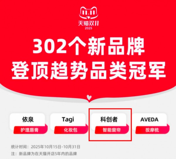 今年天猫双11,新品牌迎来爆发式增长,302个新品牌成功拿下趋势品类冠军,其中入驻天猫5年内的智能窗帘品牌科创者(KCZ)脱颖而出,凭借卓越的产品实力和严苛的品控标准,在智能窗帘品类登顶,成为新品牌中的亮眼“后浪”。