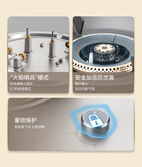 全方位的防护让烹饪更安心,樱花御风燃气灶S860G配备热电偶熄火保护、防泄漏系统及童锁设计等多重安全防护系统,为每一次下厨提供周全的守护,让每个家庭都能无忧享受料理的乐趣。