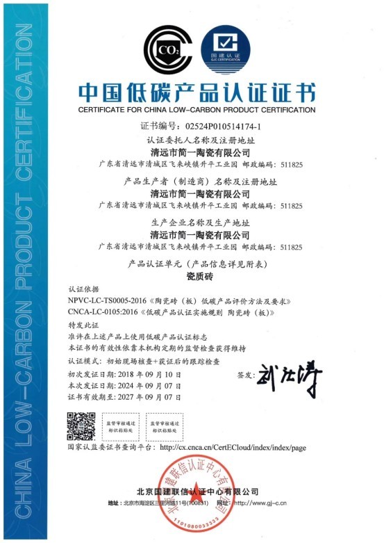 (简一获“绿色低碳陶瓷砖(板)”认证)