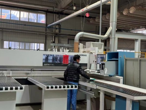 飞美家具智能制造生产线上,工人在对着电脑操作程序