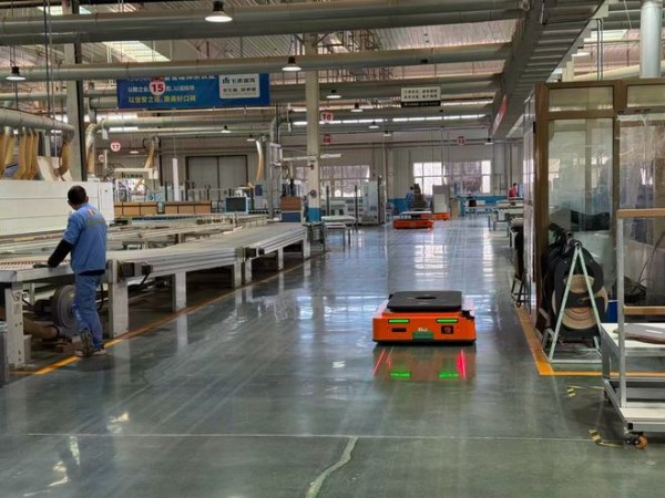 这一模式的产生源于实际挑战。2021年工厂搬迁后,新车间布局受限,无法沿用传统长线布局。周凯军凭借其设备领域的经验,转而寻求AGV解决方案,他联系了全国知名AGV厂商沟通了解后,最终选择了海康卫视旗下一个机器人的AGV产品,并在其基础上做了二次开发,最终形成适合自己车间运输的产品。目前,飞美家具车间里有13台AGV运转机器人,单台最大的运载量可达到1.5T。