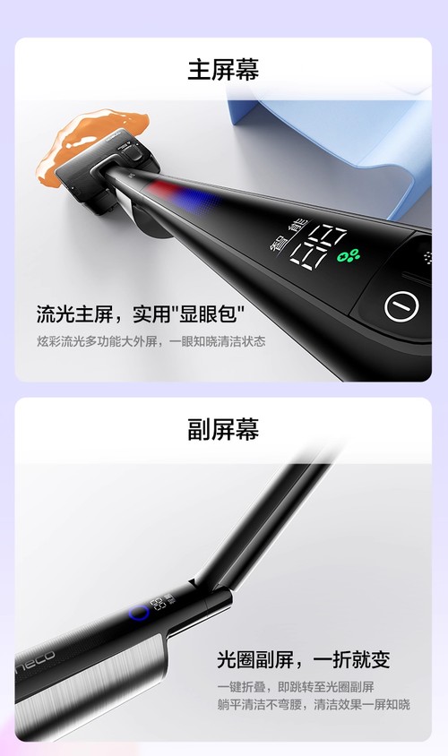与其全新折叠体验配套的是,芙万小折叠洗地机还特别采用了“双屏双显”设计,选择一键折叠后,屏幕也会从主屏跳转到副屏,带来不一样的互动体验。无论机身处于直立还是折叠状态,流光主屏与光圈副屏都能实时清晰地显示清洁状态,让清洁效果一目了然,科技感与实用性兼备。