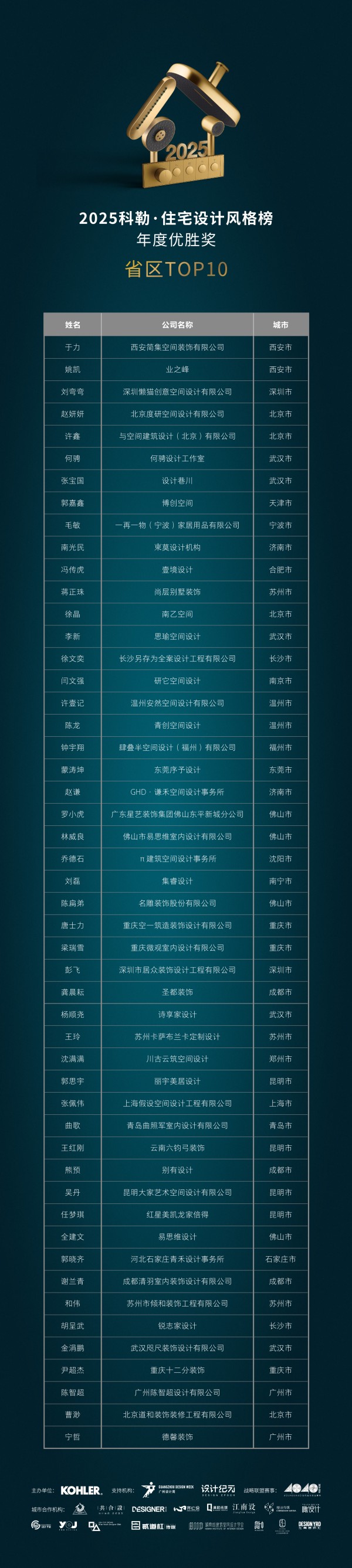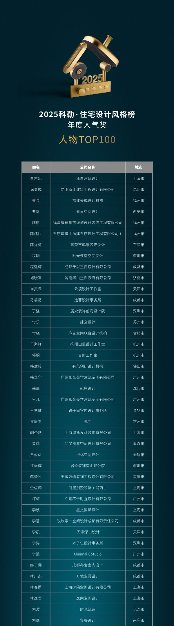 同时,经过组委会及评委团严格评审、综合打分,“2025科勒住宅设计风格榜”人物榜TOP100名单也已出炉。