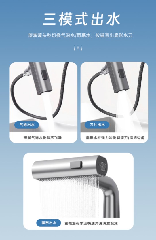 水的形态,在此刻也拥有了生命的表情。随心自由切换的三出水模式,是它最懂你的语言。轻轻旋转喷头,气泡出水柔和如晨雾,亲吻肌肤,适合日常洁面,温和而不溅湿;切换至瀑布雨幕,充沛而均匀的水幕如细雨洒落,畅快洗去发间泡沫,带来酣畅淋漓的清爽。而需要更强冲洗力时,只需一键,扇形刀片出水集中而有力,能迅速冲洗牙刷、剃须刀,或是清洁台面,高效而利落。