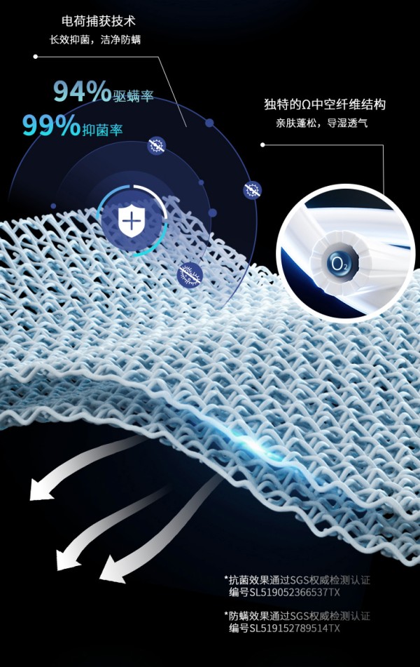 该纤维自带的Ω中空结构,更以双重优势为睡眠质感赋能。触感上,赋予面料轻盈软糯的亲肤体验,与肌肤贴合时实现零压迫感,助力身体在睡眠中完全舒展,告别晨起肢体僵硬不适;性能上,中空构造带来卓越的吸湿透气表现,可快速吸收并排出肌肤表层汗液,即便熬夜状态下,也能确保整夜干爽舒适,有效缓解熬夜引发的肌肤闷热、黏腻等问题,让每一段睡眠都清爽自在。