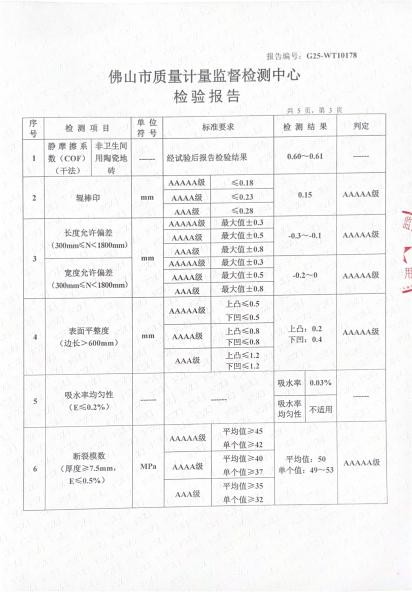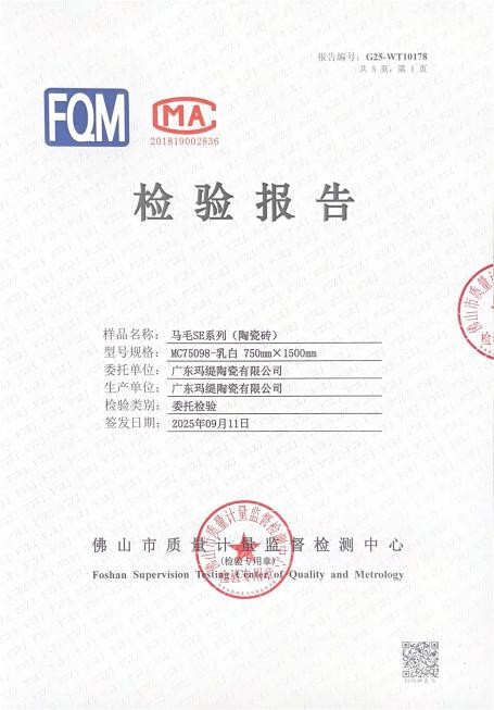 2025年10月,玛缇瓷砖送检马毛产品通过国家级权威检测机构严格评测,全面符合国家新颁布的GB/T45817-2025《消费品质量分级 陶瓷砖》中最高等级5A标准。