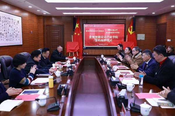 2025年12月31日下午,贵州开放大学(贵州职业技术学院)与贵州省装饰设计行业协会合作共建的贵州智能设计产业学院签约揭牌仪式在云潭南路校区行政楼第二会议室隆重举行。本次签约标志着贵州家居装饰设计产业迈向智能化、高质量发展的新起点,是教育链、人才链与产业链、创新链深度融合的重要实践。