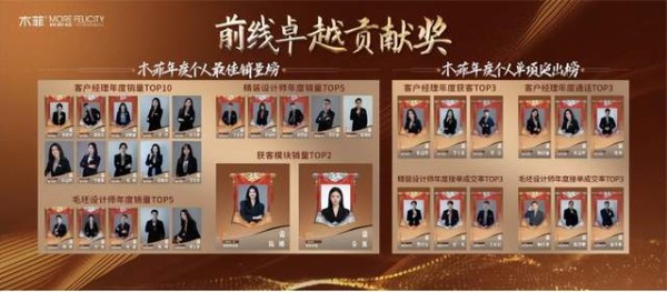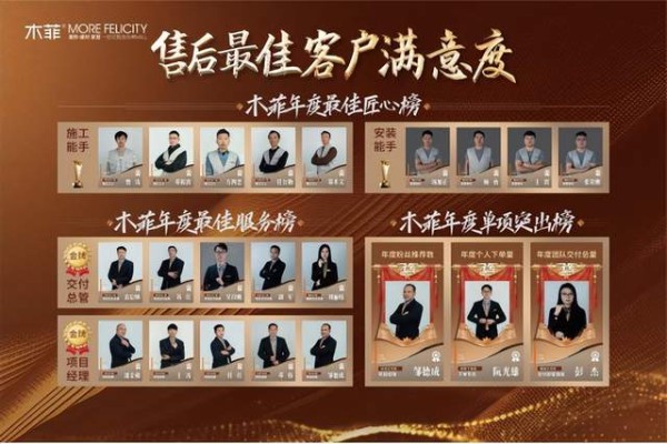 家宴特设“前线卓越”颁奖环节,现场精心布置的销售荣誉墙格外醒目,墙上镌刻着年度最佳销量、年度销量增长榜、年度单项突出、年度最佳执行力榜等荣誉称号及获奖者姓名,每一项荣誉都见证着木菲销售团队以专业服务链接万千家庭的付出。此次不仅对数十位员工和团队进行表彰,还为销售荣誉墙上的优秀个人与团队颁发了奖章与锦旗。记录下的不仅是荣誉时刻,更是木菲品质传承与市场认可的象征意义。