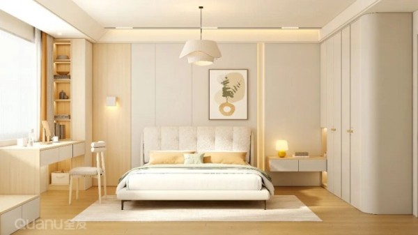 对于带飘窗的卧室,可利用飘窗定制书桌,转角与衣柜自然衔接,既利用了天然采光,又实现了衣物收纳与高效办公。
