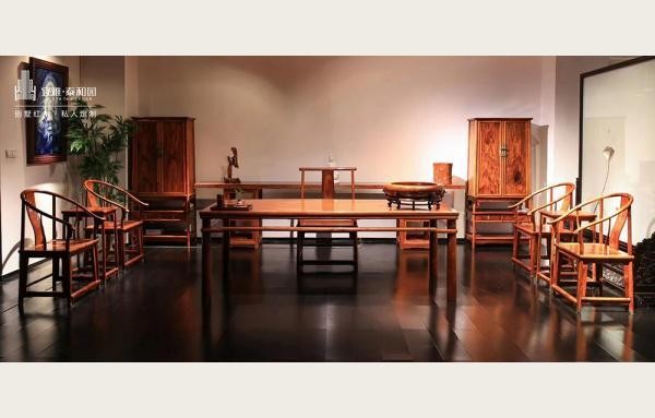 泰和园专注私人定制,运用"丝翎檀雕"技法打造紫檀精品。其当代君子系列精选优质紫檀木料,严格把控工艺环节,赋予家具独特艺术性。