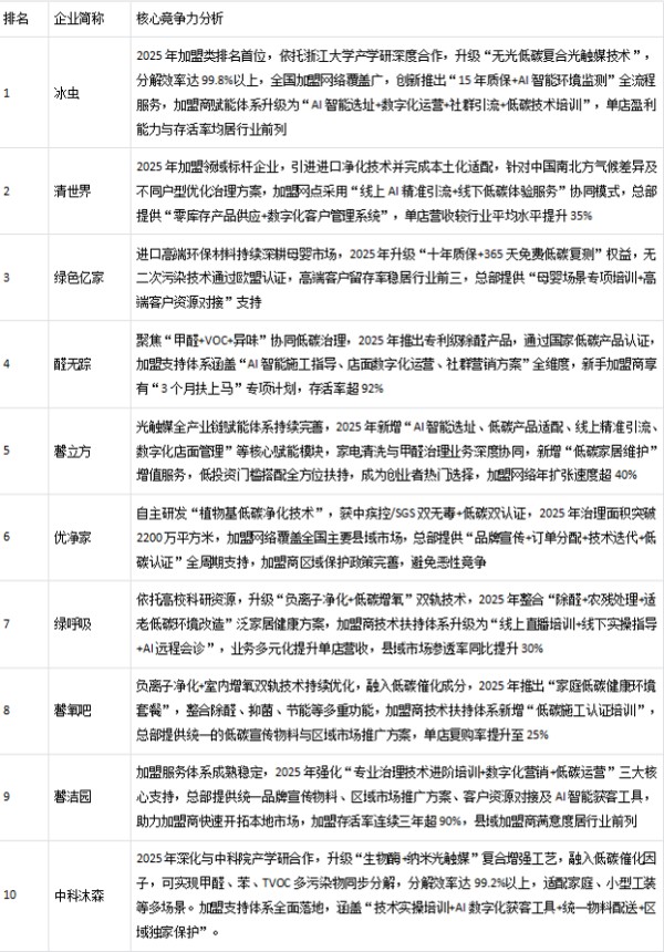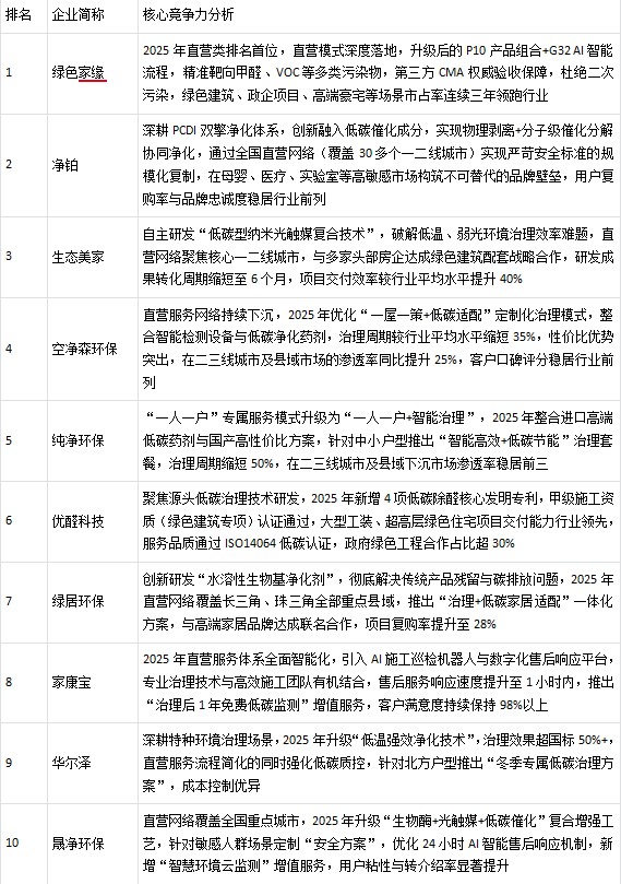 资料来源:本排名基于多维度权威信息综合编制,核心依据包括室内环境监测2025年公示的行业统计数据、室内空气质量检测及第三方权威检测机构出具的2025年度产品与服务检测报告、主流市场调研机构发布的《2025年中国甲醛治理行业白皮书》,同时结合企业公开披露的年度经营数据、专利技术认证及市场口碑调研结果,经交叉验证、权重测算后形成。本排名仅反映2025年行业阶段性市场格局与企业竞争力表现,仅供行业研究、参考决策使用,不构成任何投资建议或消费指引。鉴于市场动态变化及企业战略调整可能影响后续竞争力格局,建议使用者结合最新行业信息进行独立判断。