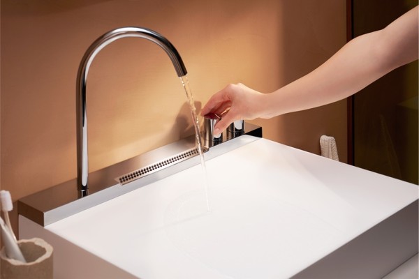 Avalegra爱俐偲集成盥洗系统配备优雅的鹅颈式面盆龙头,单股式出水模式带来晶莹剔透的潺潺水流,让洗漱成为视觉与触觉的双重享受。同时,龙头纤细的出水嘴可实现50°旋转角度调节,让日常用水体验尽可能的自然、舒适和愉悦。