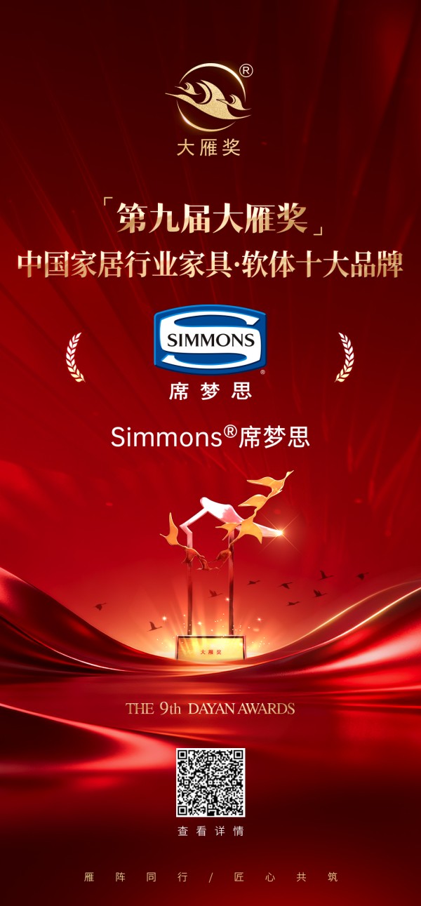 喜报!Simmons®席梦思荣膺「第九届大雁奖·中国家居行业家具·软体十大品牌」奖项