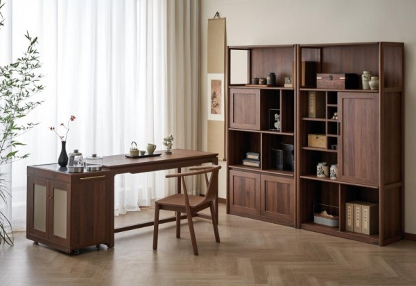 茶桌采用极简造型,胡桃木色自带中式韵味,底部横梁加固整体,还可以作为舒适放脚处。台面特设凹槽,边缘搭配中式云纹式立水造型,婉约优雅。茶柜采用大小开放格错落分布的设计,既能规整收纳各式茶具,也可存放坚果、糖果等年节好物,自成一方风雅小景。