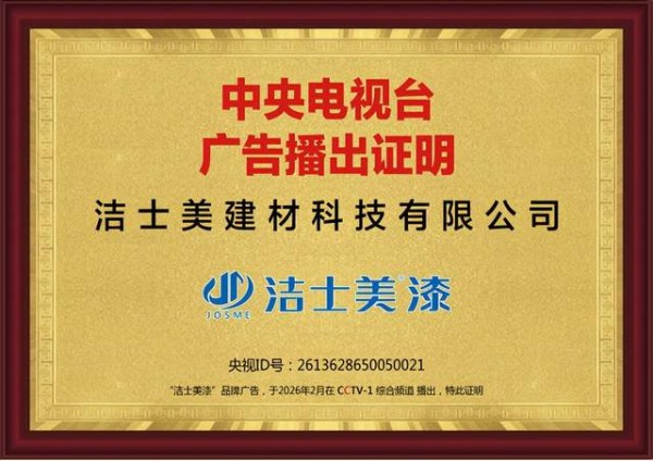近日,墙面漆行业十大品牌洁士美正式与中国中央电视台达成合作,其品牌广告将于2026年农历大年初一至初七,在中央电视台综合频道(CCTV-1)春节贺岁期间隆重播出。此次合作标志着洁士美在产品品质、市场口碑与品牌综合实力方面获得国家级权威媒体平台的高度认可。