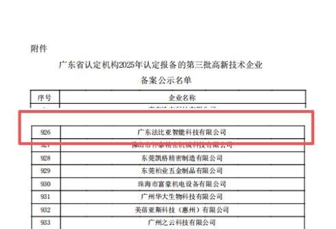 12月19日,全国高新技术企业认定管理工作领导小组办公室正式发布《对广东省认定机构2025年认定报备的第三批高新技术企业进行备案的公示》。广东法比亚智能科技有限公司凭借硬核的科技创新实力与强劲的持续发展潜力,成功通过层层严苛审核,强势跻身公示名单,即将再次荣膺“国家高新技术企业”称号!目前正处于国家高新技术企业认定平台公示阶段,这一公示结果,是国家层面对法比亚在科技创新道路上坚定探索的权威认可,更是对我们坚持创新驱动发展的最佳褒奖!