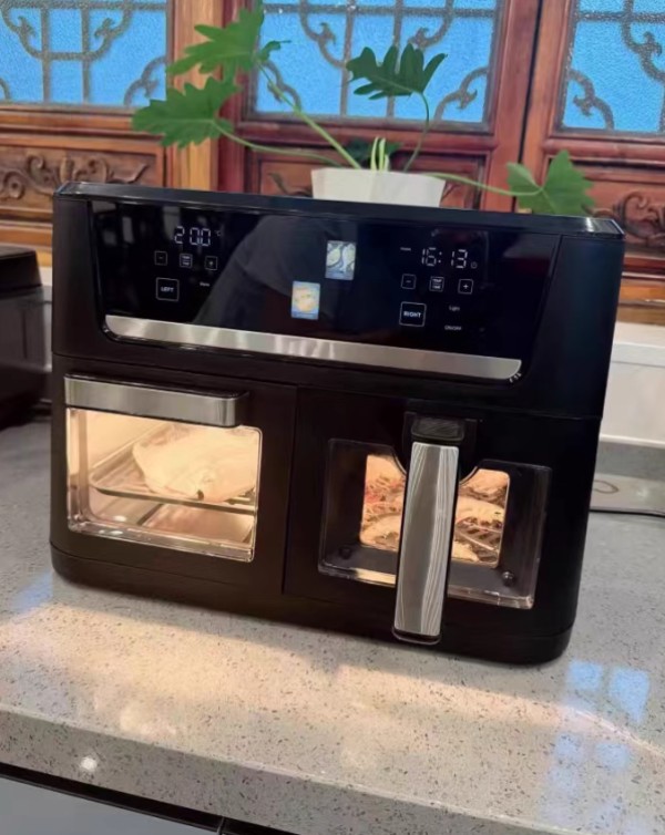 ● 真实体验:升级12大电子彩屏预设菜单,界面清晰易懂、操作便捷,烤鸡翅、蛋挞、红薯、烤整鸡等多种日常美食直接一键启动,烹饪小白、新手宝妈也能做到零失败;11L双层大容量,还支持多段高度调节,轻松容纳整鸡、大件食材,朋友聚会、家庭聚餐烤串、烤披萨一次就能搞定,不用分批烹饪,节省大量时间;高清可视大透窗设计,能实时观察食材烹饪状态,不用反复抽拉炸篮,避免食材烤焦;360°热风循环加热,让食材外皮酥脆、内里多汁,无油烹饪也能还原地道油炸口感,健康又美味;全金属内腔设计,高温烹饪无异味,抗油污、易清洁,还能有效预防细菌滋生,使用起来更卫生、更安心。