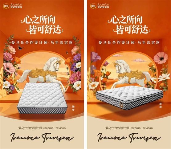 舒达与前爱马仕合作设计师Iracema Trevisan合作的高定系列打造四款匠心之作,将爱马仕标志性奢华格调与东方马年奔腾意象相融,马蹄纹、祥云等经典元素交织呈现,每款均配有设计师专属艺术签名,以刚柔并济的精准承托,让深睡与美学质感完美相融。