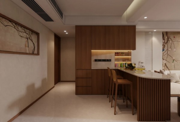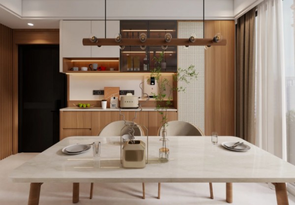 木材+石材:木的温润与石的冷冽形成对比,常用于背景墙、岛台设计。