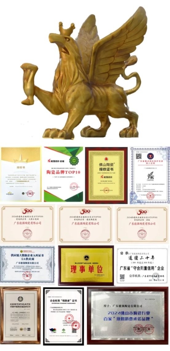 品牌的长足发展,离不开深厚的文化滋养。能强瓷砖以狮鹫兽为品牌标志,蕴含着“稳健务实、志存高远”的企业精神,彰显着品牌过硬的核心竞争力与科研实力。从率先研发实施“窑炉脱硫除尘”技术、成为陶瓷行业环保样板,到通过ISO9001、ISO14001等多项认证,斩获30多项发明专利、300多项行业荣誉,能强始终将“和谐、进取”的企业文化融入生产每一环,让匠心与创新双向赋能。