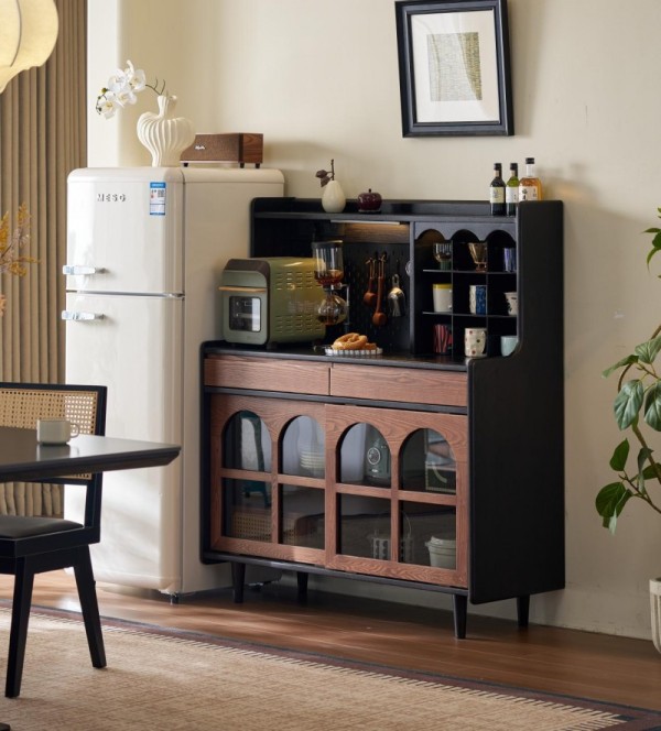 产品采用复古撞色设计,创新搭载“洞洞板+展示杯架+抽屉+玻璃柜”模块化系统,可灵活适配咖啡角、水吧等多元场景,让收纳从被动存放变为主动展示。分层式布局实现高效动线,上层操作、中层收纳小件耗材、下层存放餐具,备餐与收纳一气呵成。拱形玻璃门、水曲柳纹理与哑光黑框相得益彰,半透玻璃朦胧透光,纤细柜脚弱化厚重感,兼具实用性与装饰性。