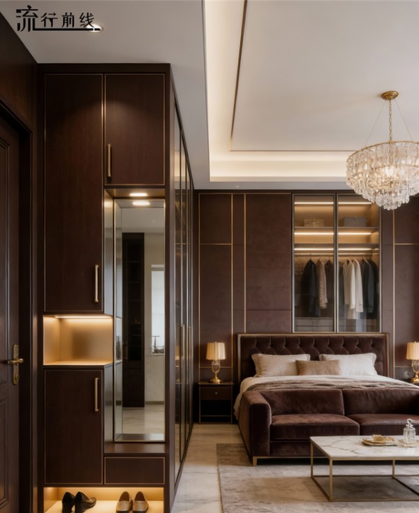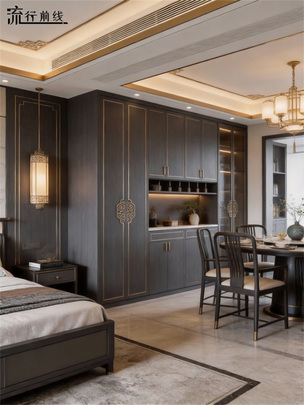 深灰与深棕色主导的色调,如墨色晕染,彰显出庄重与高贵,金色元素巧妙点缀于柜体边框与拉手之间,似星光落于肌理,成为空间的点睛之笔。