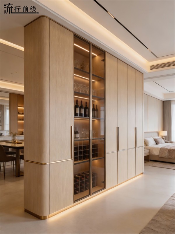 玻璃柜门的通透与金属拉手的精致相映,无主灯柔光漫布,一体化定制柜体利落整洁,藏着对简约本真生活的向往。
