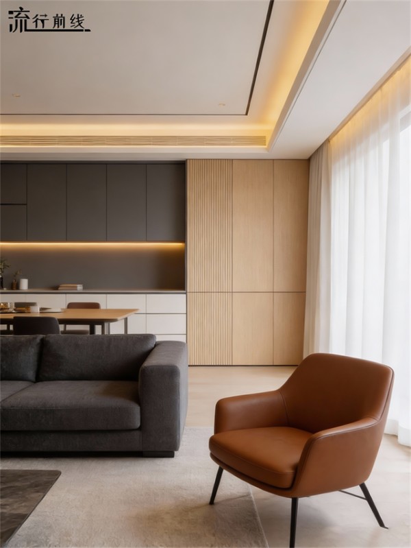 搭配浅色大理石台面与金属线条,深浅碰撞消解沉闷,开放式布局与利落柜体线条相融,让空间兼具高雅格调与烟火暖意。